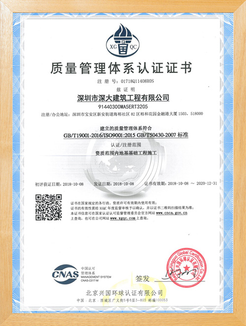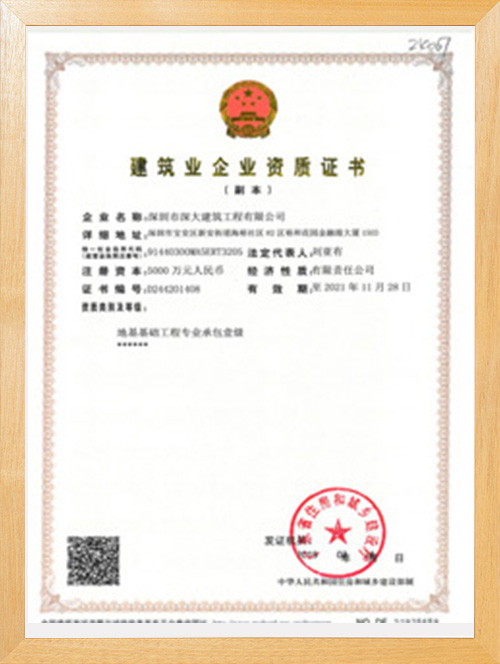 深圳市深大建筑工程有限公司,成立于2017年,注冊資本5000萬,總部位于深圳市寶安區中心地段。公司擁有地基基礎工程專業承包壹級資質,市政公用工程施工總承包二級資質,是一家一體化現代型企業。公司重視企業內部管理與發展,嚴格實施ISO管理體系,率先通過了ISO9001質量管理體系認證、環境管理體系及、職業健康安全管理體系的認證。為公司的長遠發展奠定了穩健基礎。